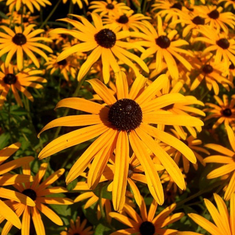 Black-Eyed Susan (Rudbeckia hirta) is a perennial coneflower with yellow-orange, slightly curved petals, each toothed at its apex. The 1-3 ft. stems and scattered, oval leaves are covered with bristly hairs. Flower heads are 2-3 in. wide.