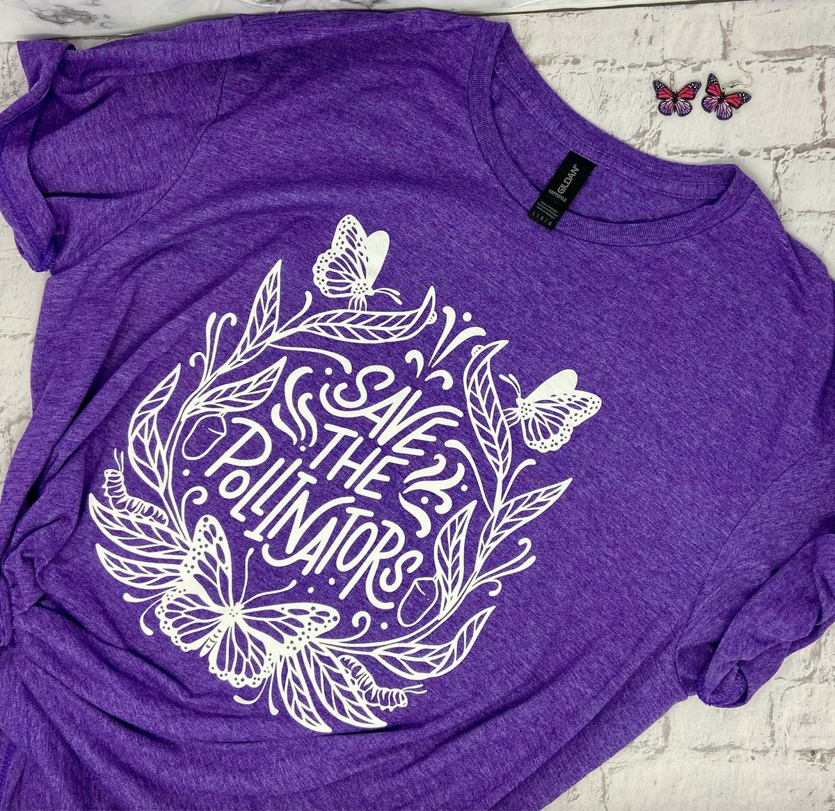 The beautiful, original design on these t-shirts draws the eye toward its simple but important message! It is a great way to invite people to think about the plight of our native pollinators. In addition, the graphic features every stage of the Monarch Butterfly's lifecycle! Look for each: egg, caterpillar, chrysalis and butterfly!